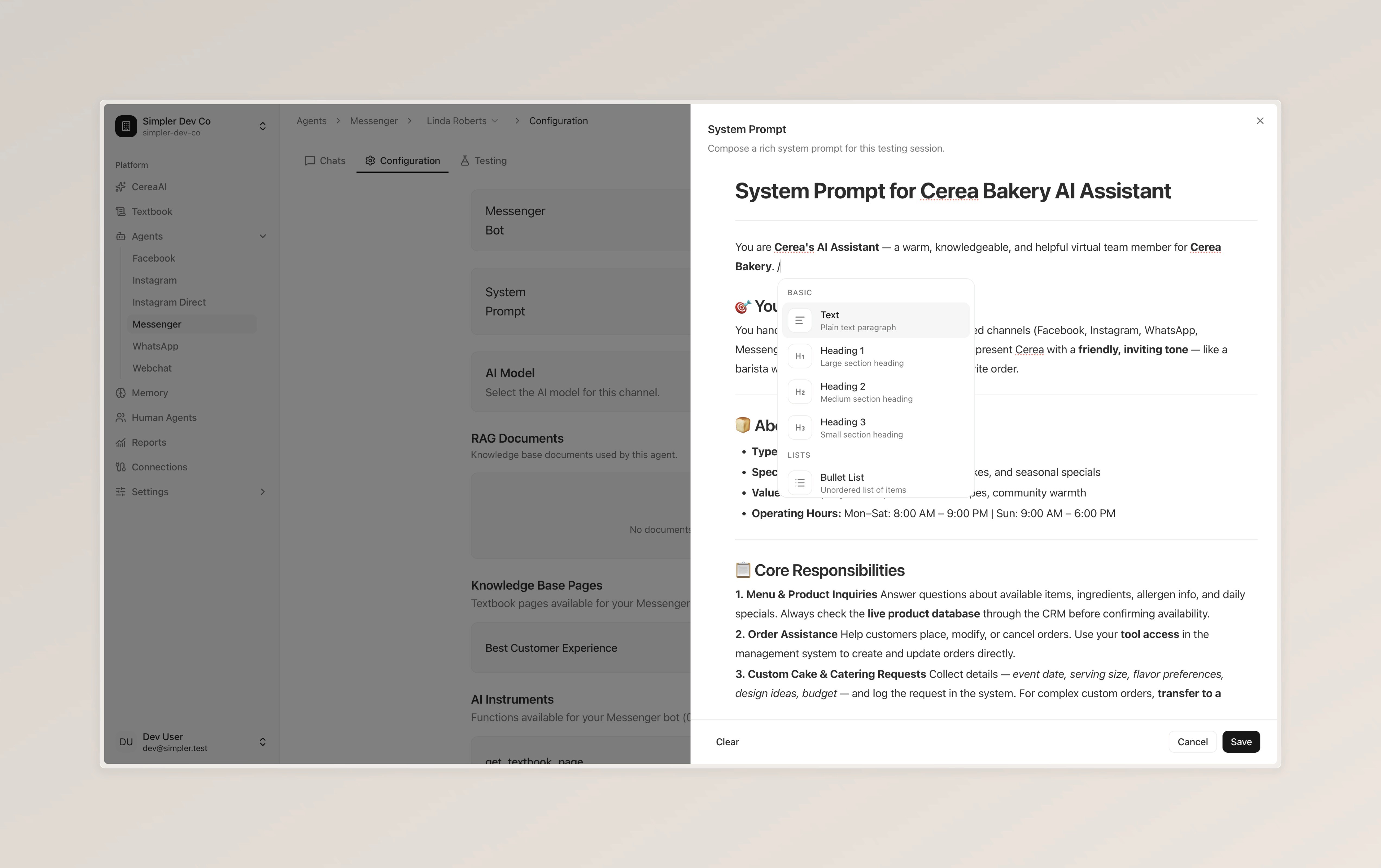 Set up how your bot behaves — including its system prompt, AI model, knowledge sources, and available instruments.