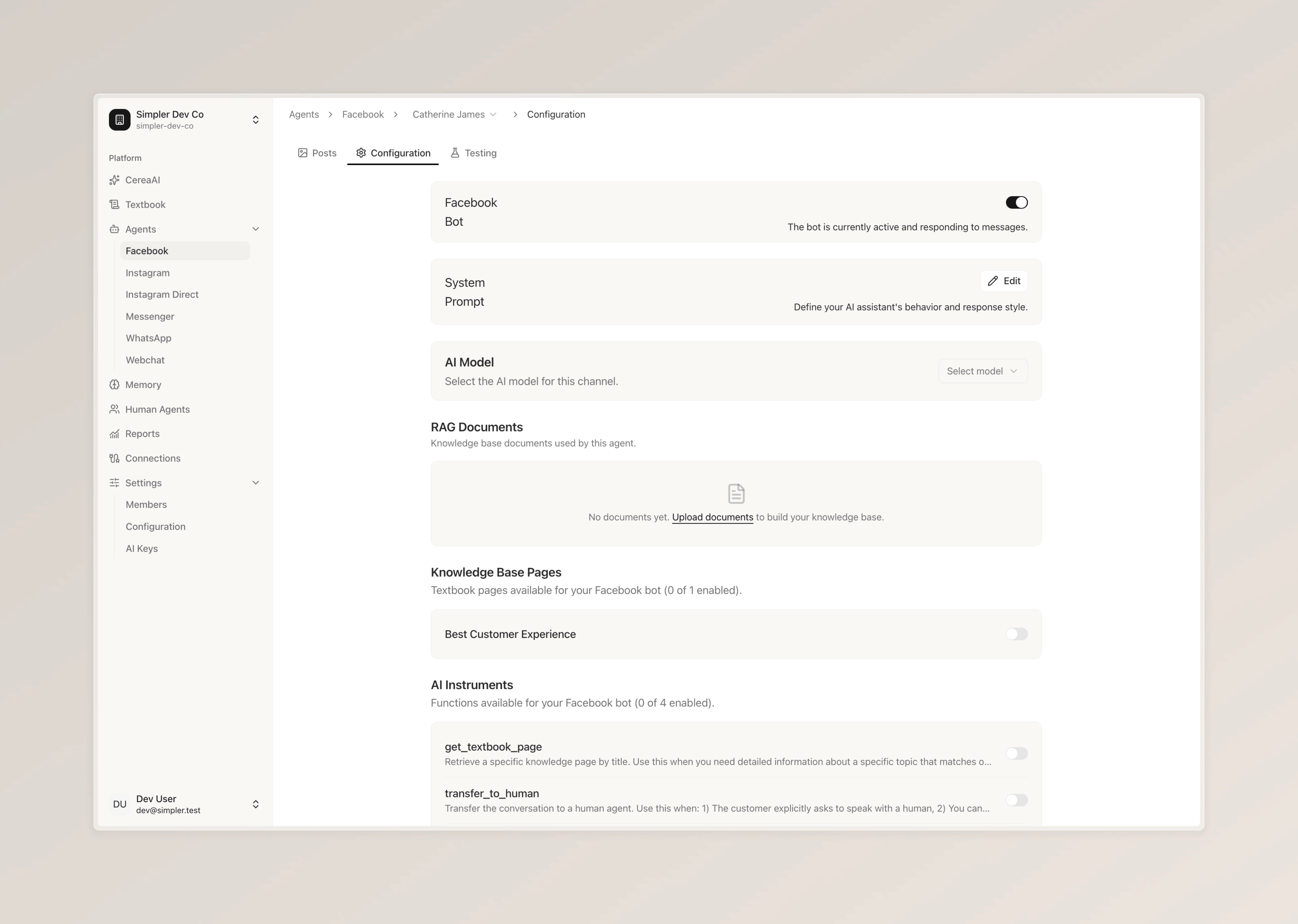 AI Instruments — These are special actions that your bot can perform. For example, "get_textbook_page" allows the bot to look up a specific knowledge page, and "transfer_to_human" lets the bot hand the conversation over to a human agent when needed. You can enable or disable each instrument depending on what you'd like your bot to be able to do.