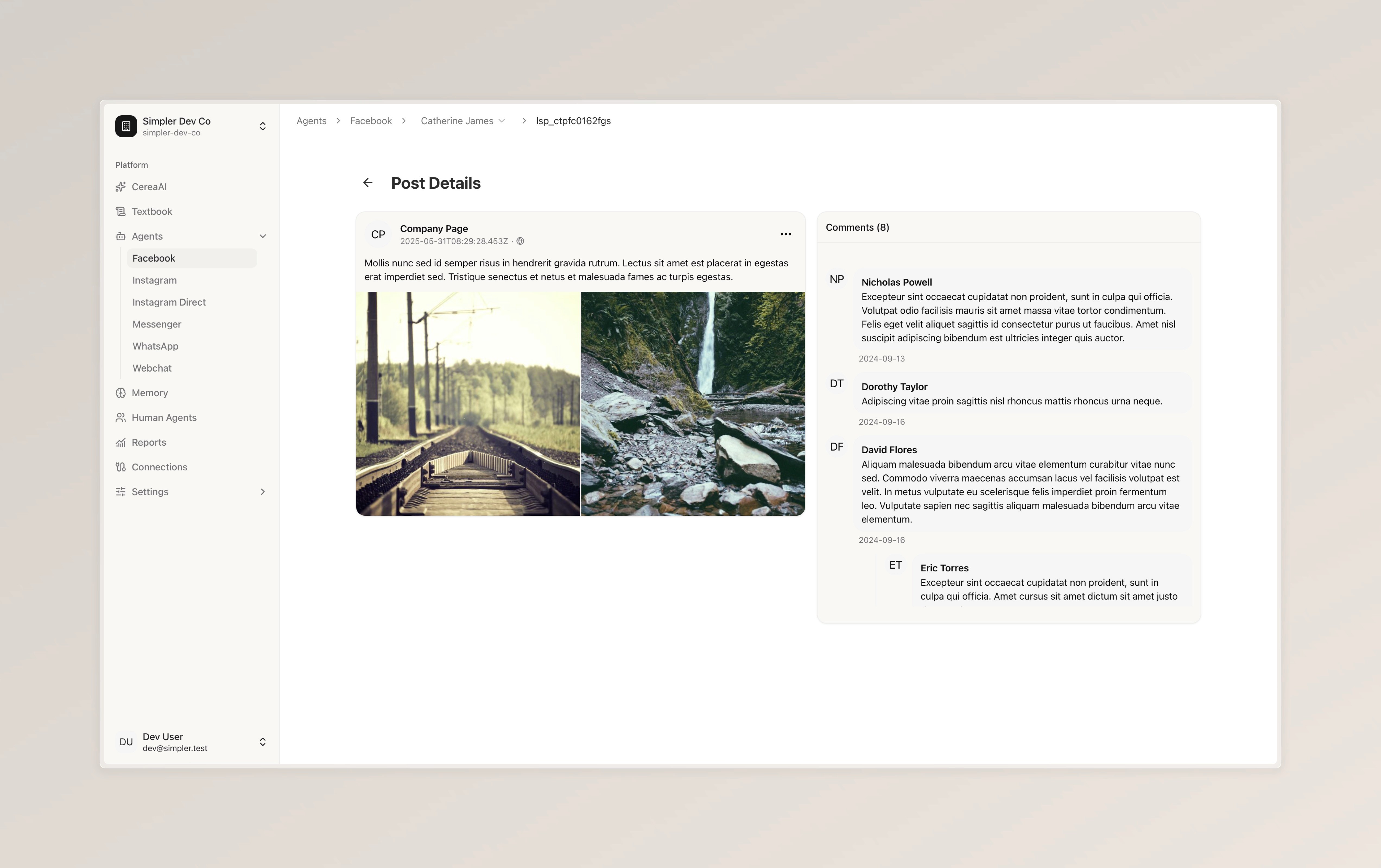 Browse all posts from your connected Facebook and Instagram pages, along with their comments and the bot's replies.