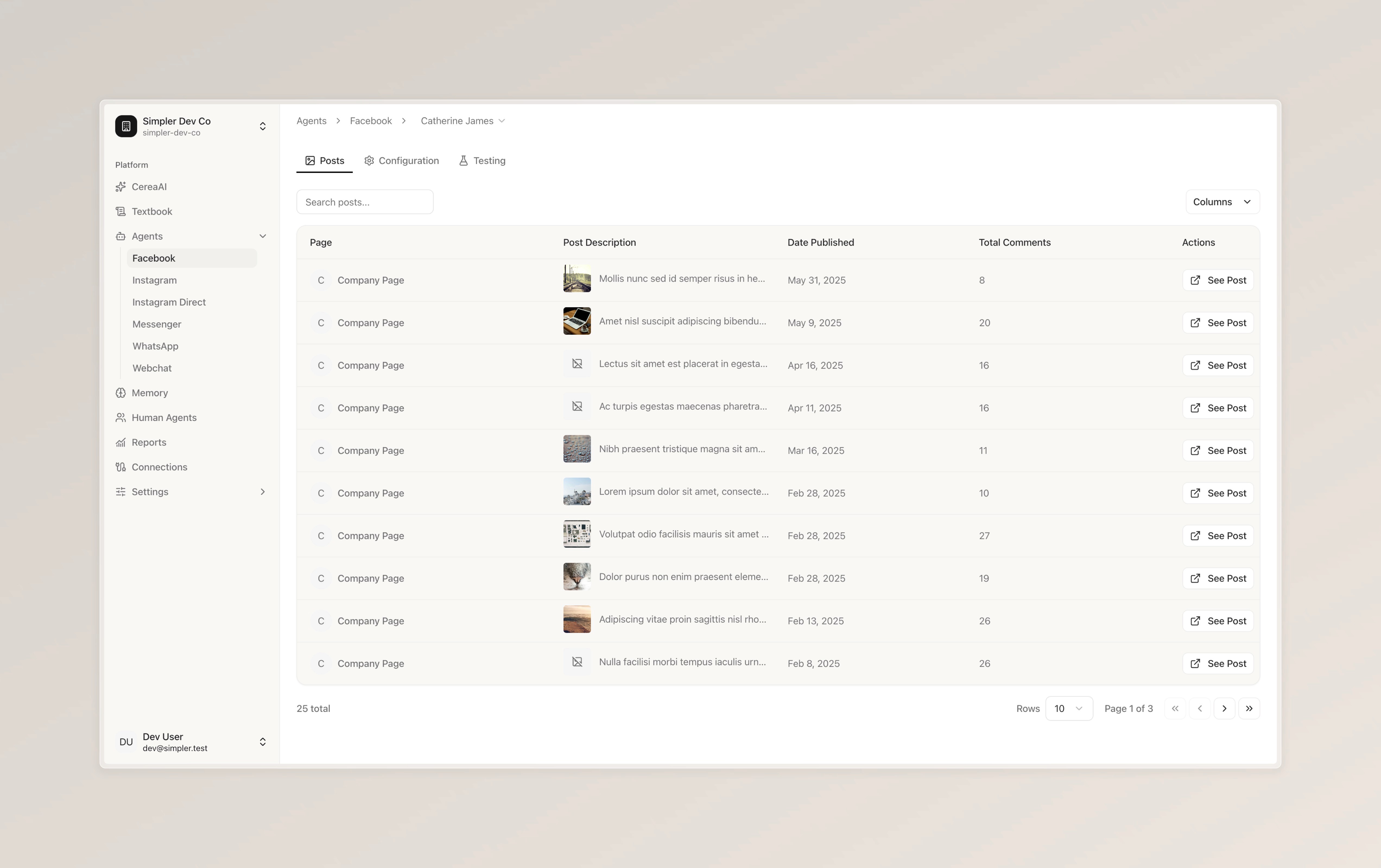 You'll also notice three tabs. "Posts" is the page you're currently viewing. "Configuration" allows you to customize how the bot behaves on this particular Facebook page. "Testing" gives you a safe space to try out the bot before any changes go live, so you can make sure everything is working exactly the way you'd like.