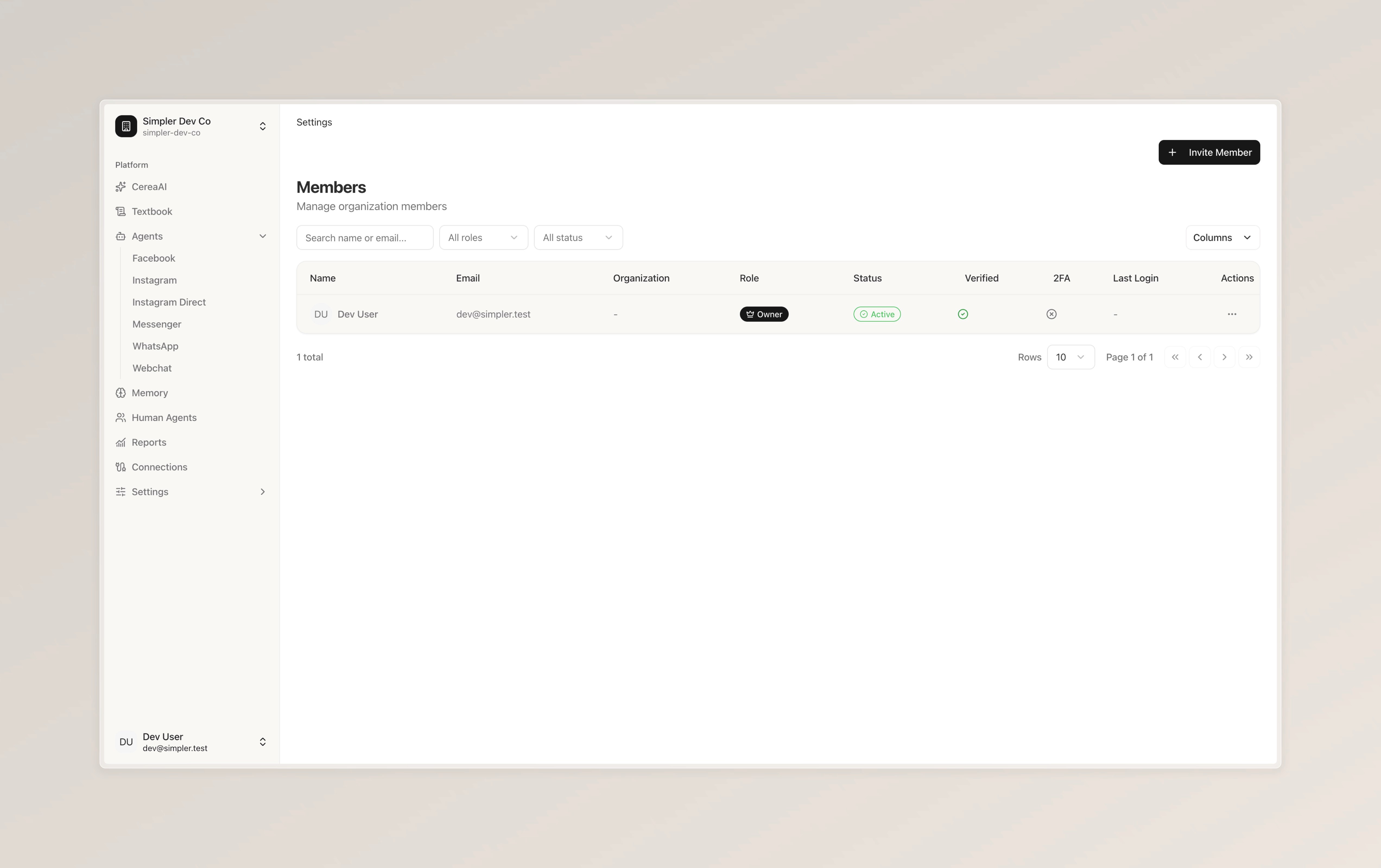 This is where you manage everyone who has access to your organization's dashboard. You can see all your team members listed here with their name, email, role, status, and other important details.